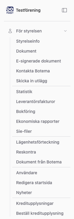 ![]() | Till vänster hittar du hela menyn för tjänsten. Menyn går att fälla in och ut genom knappen längst upp till höger. Under rubriken För styrelsen finns alla funktioner för styrelsen. Vissa sidor behöver föreningen vår utökade portal, Bowebb Bas eller Bowebb Plus för att komma åt. Styrelseinfo: Här presenteras diverse information för styrelsen som nyhetsbrev, mallar, kontaktperson hos Botema, mm. Dokument (Bowebb Plus/Sign): Här hanterar du föreningens egna dokument som användare med styrelsebehörighet kan ladda upp. Det är härifrån du även skapar e-signeringar.