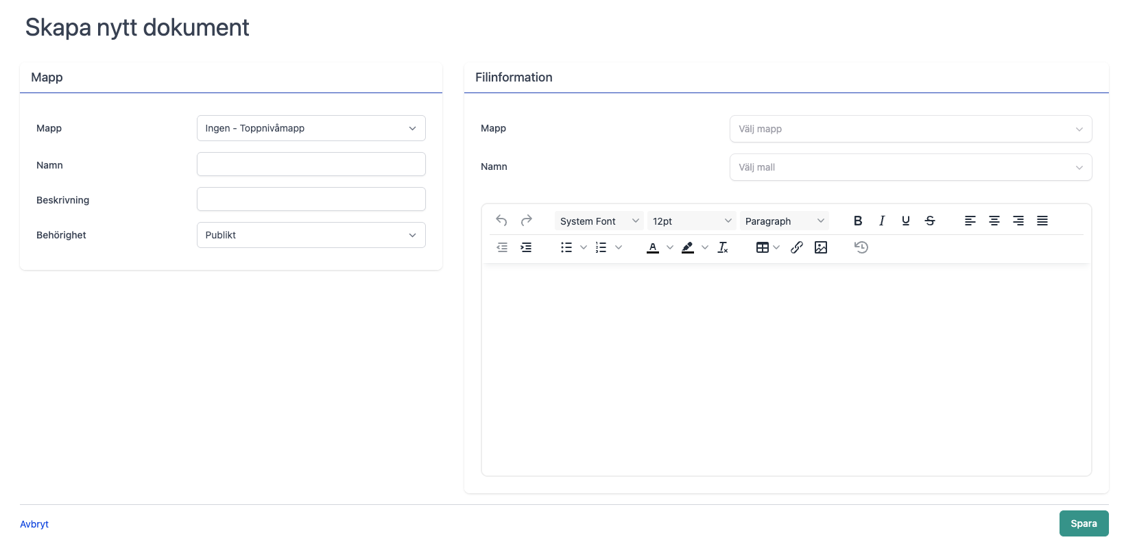 Om du inte har någon mall ännu att utgå från så går det bra att skapa dokumentet från tomt blad genom att skriva information i rutan till höger. Om du däremot vill utgå från en redan skapad mall så välj mallen i rullistan ovanför fältet så kommer rutan att förifyllas med mallen.