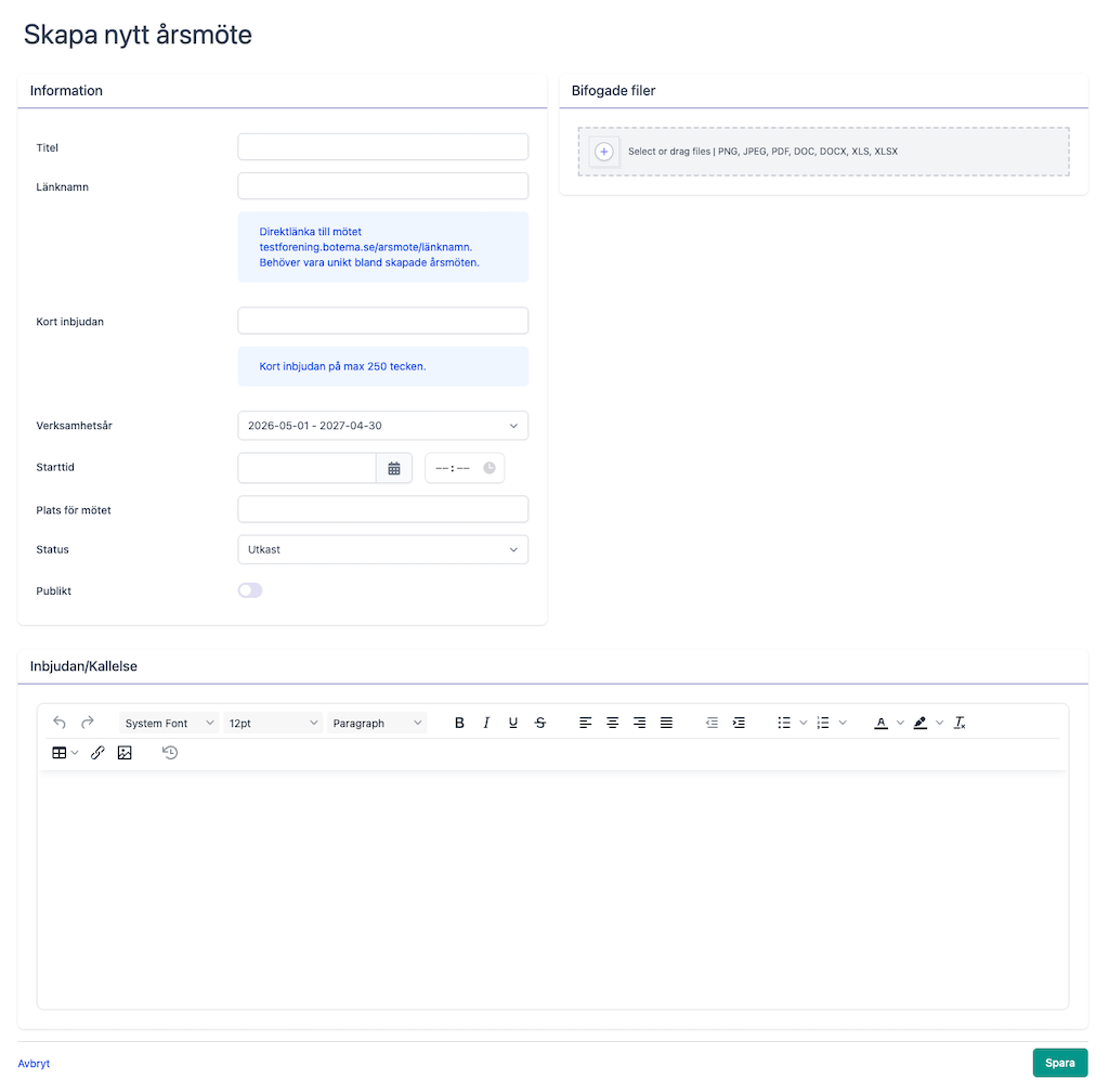| Länknamn | Detta blir direktlänken till just denna årsstämma. Anger du t.ex 2026 så kommer direktlänken bli under er egna sida: https://foreningsnamn.botema.se/arsmote/2026. |